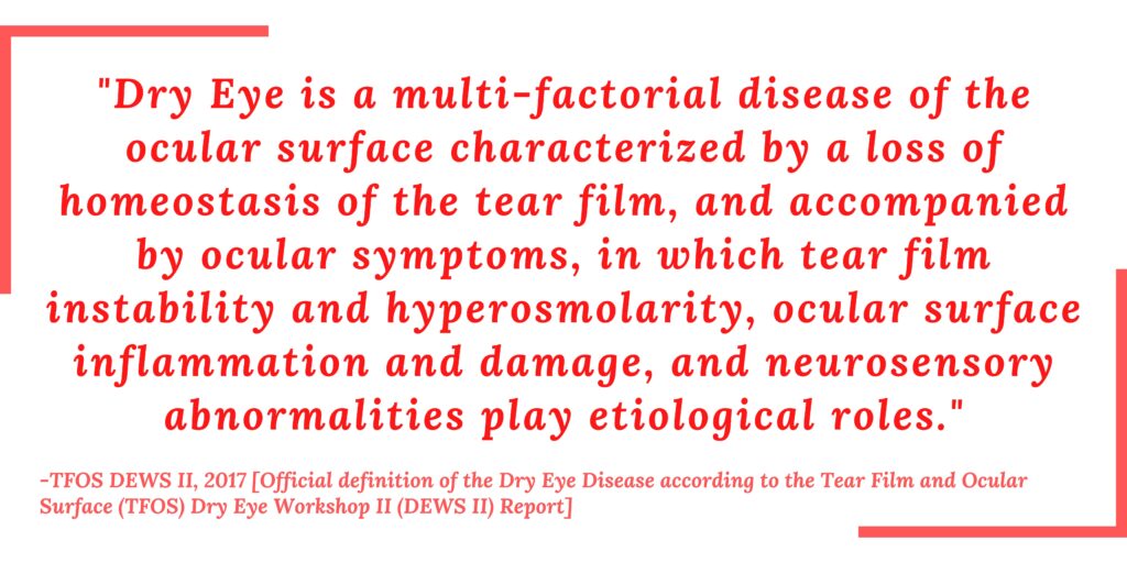 Dry Eye Syndrome is due to a dysfunctional tear film. When you blink, the tear film spreads over the front surface of the eye. The tear film is comprised of three main layers: oil, water and mucus. Within those three layers are many tiny electrolytes and proteins that create a stable mixture for a functional layer on the eye. This layer provides consistent vision, protection, healing properties, and comfort. When the layers are not performing adequately or the layers are overrun with inflammation, breakdown in the tears occur and dry eye disease begins.